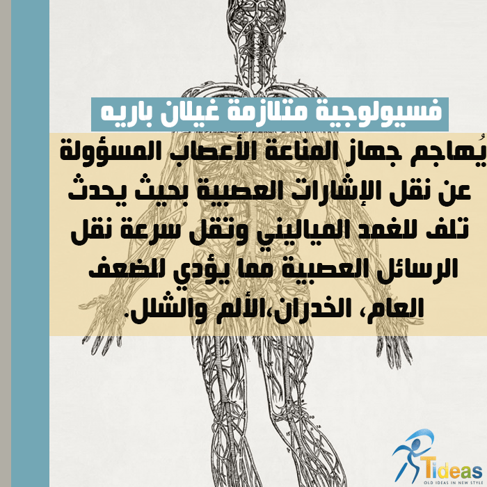 وتؤدي متلازمة غيلان باريه إلى ضعف في العضلات، وفي حالات شديدة، إلى مشكلات في التنفس، ما يستدعي رعاية طبية. ولكن تزداد المخاطر مع التقدم في العمر. متلازمة غيلان باريه هي اضطراب نادر تتم فيه مهاجمة الأعصاب الطرفية بواسطة الجهاز المناعي مما يؤدي إلى تلفها ومن أعراضها الإحساس بالتنميل، وخز وضعف في الأطراف وعدم التوازن أثناء المشي وصعوبة في حركة العينين أو الوجه. متلازمة غيلان باريه هي اضطراب في المناعة الذاتية يؤثر على الجهاز العصبي المحيطي. حقيقة أم خرافة قد تضرك؟ الوقاية من آلام الظهر معلومات عن متلازمة غيلان باريه
